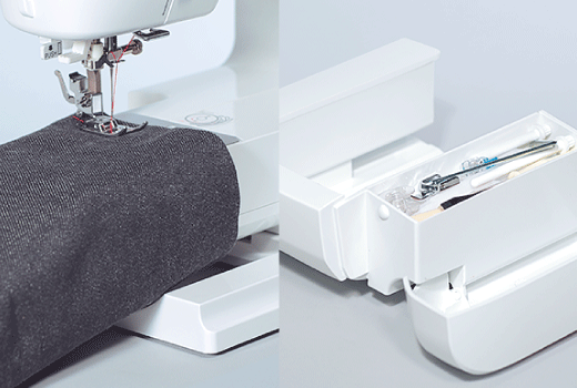 附件盒可滑開,用于筒形縫制。此外,可將標(biāo)準(zhǔn)附件整齊地收存在附件盒內(nèi)。