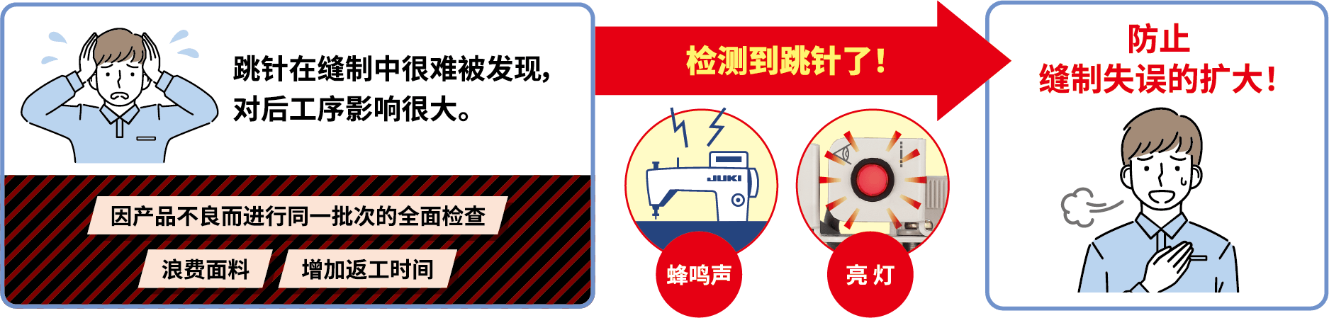 能防止縫制失誤的擴(kuò)大,減少浪費(fèi),提高了生產(chǎn)性!