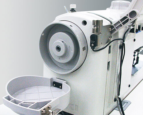 使用專用梭芯,通過傳感器檢測(cè)梭芯的底線余量。在梭芯的底線余量達(dá)到規(guī)定值時(shí),就會(huì)發(fā)出蜂鳴聲和點(diǎn)亮綠燈,并讓縫紉機(jī)停止。縫紉工可以不用擔(dān)心底線的余量而專心工作,提高了生產(chǎn)率。