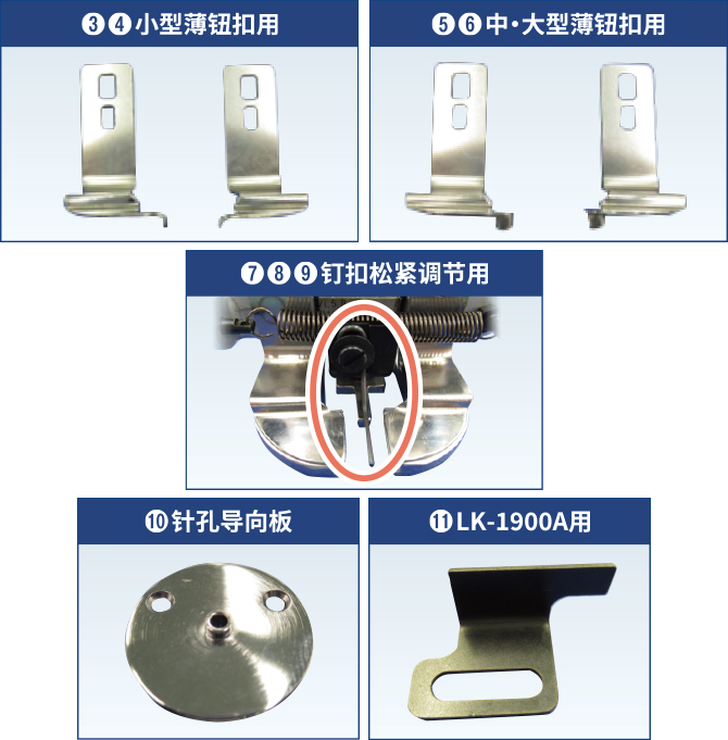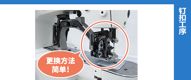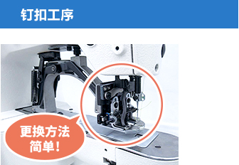可對(duì)應(yīng)多種尺寸的紐扣。(外徑8 ~21mm、 厚度1 ~ 4.5mm 、紐孔間隔4.5m以下均可縫制)由于壓腳壓力集中在紐扣夾具部的前端,消除了因布料偏移而造成的縫制不良。由于壓腳為垂直動(dòng)作,不會(huì)因布料的厚度而造成紐扣中心位置偏移。