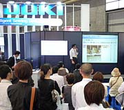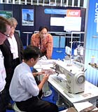 在新商品展位內(nèi),使用了大型的顯示器,除了以演示的形式進行說明以外, 還設(shè)置有ISS(智能化縫制系統(tǒng))進行公開演示的縫制流水線,可交替進行縫制研究所日?;顒拥囊徊糠帧缚p制現(xiàn)場的可視化」、以及小工具、縫制技術(shù)服務(wù)活動(營業(yè)技術(shù)室)等的演示活動。