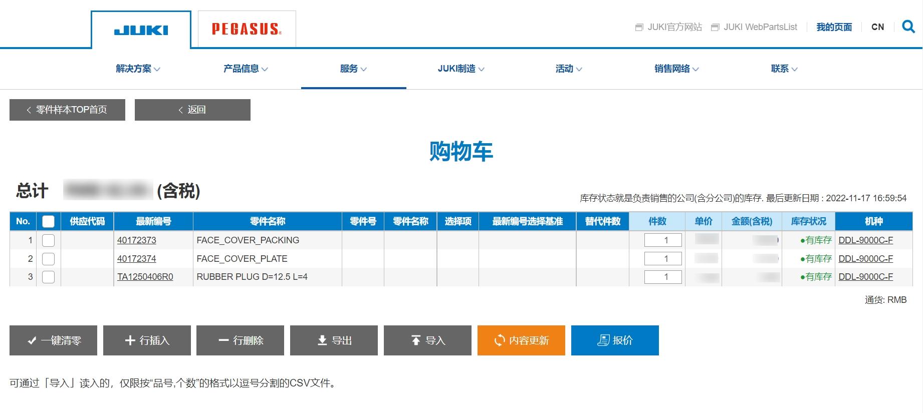 零部件表內(nèi)的零部件可添加到購物車?yán)铩L砑拥劫徫镘嚨牧悴考奢敵龅紼xcel,便于將需要的零部件進行列表。另外,也可在購物車內(nèi)確認(rèn)價格或庫存、進行詢價委托。