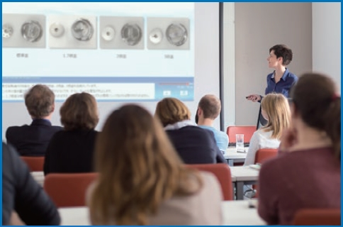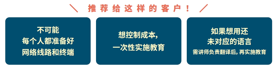 這是使用教材的授課方式。在公司內(nèi)準(zhǔn)備好主持人(講師角色)、可一次召集很多人進行授課。為了讓公司內(nèi)的講師更容易講課、我們準(zhǔn)備了各種資料。