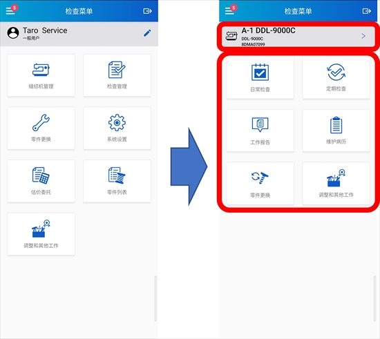① 使用頻率高的功能方便訪問,「日常檢查」「定期檢查」等放在了TOP畫面上。先選擇縫紉機機種,在不進行選擇其它另外機種的情況下,可以對已選擇機種進行各種訪問和使用。