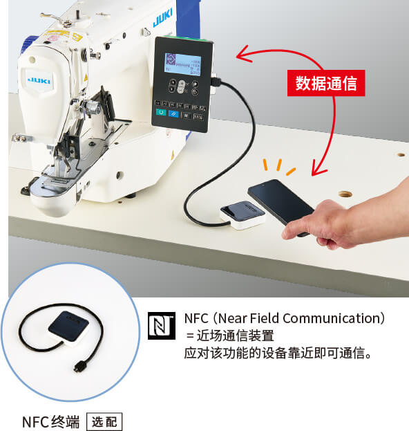而且使用選配的NFC端口、可通過市面上銷售的 Android 設備實現(xiàn)非接觸式雙向數(shù)據(jù)通信。這樣一來,可以與其他縫紉機實現(xiàn)快速共享預設的縫紉數(shù)據(jù),從而減少換款準備所需的時間。