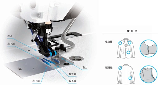 通過精密控制上下配置的 “皮帶送料輔助系統(tǒng)” 來輸送布料,可重現(xiàn)熟練操作人員的高水平操作(布料調(diào)控技術(shù))。尤其在需要精細曲線的困難工序(如縮縫、曲線縫、縮縫 + 曲線縫),如細腰、背部中心、裝袖等部位的縫制中,可提高操作人員的工作效率,有助于提升生產(chǎn)效率。