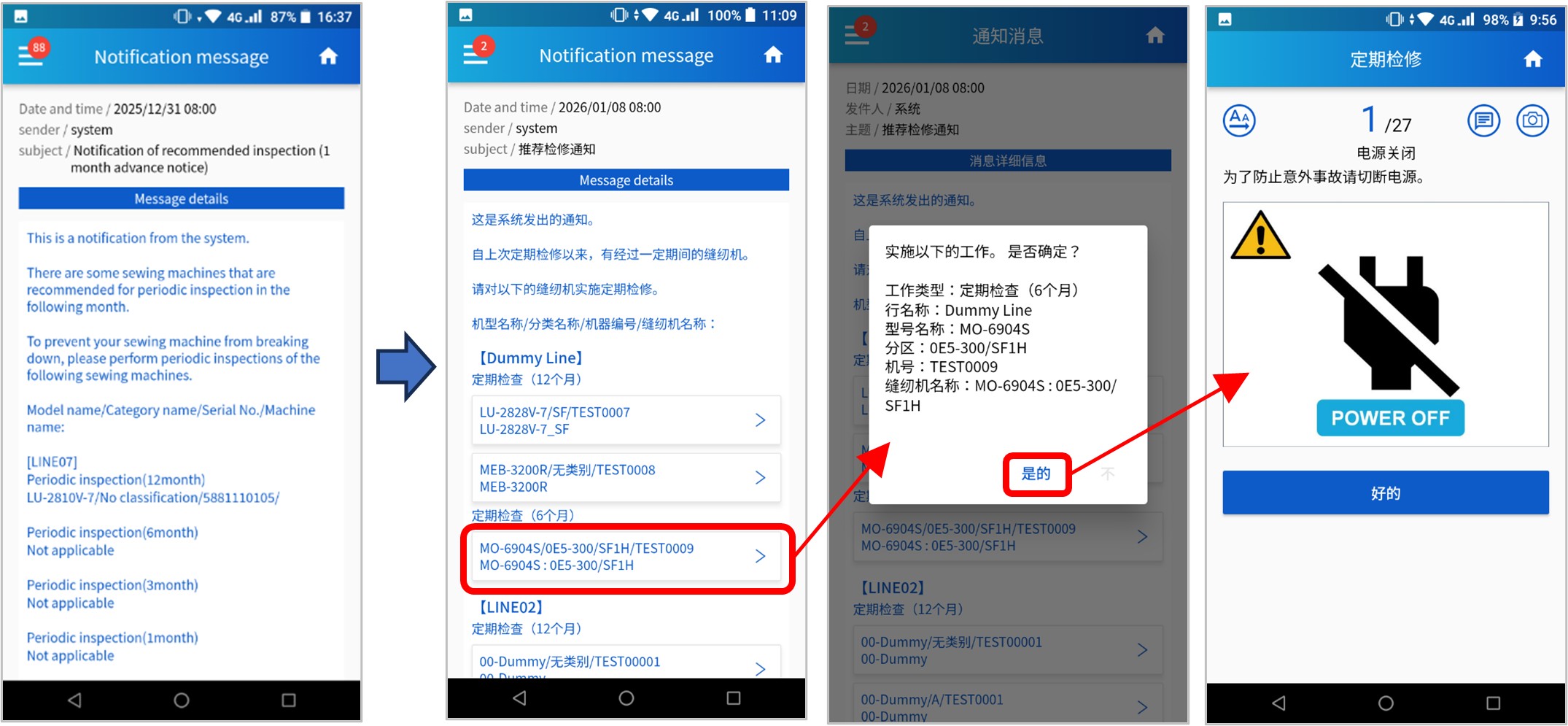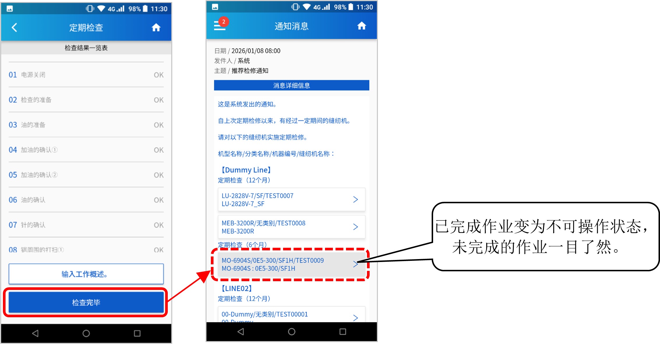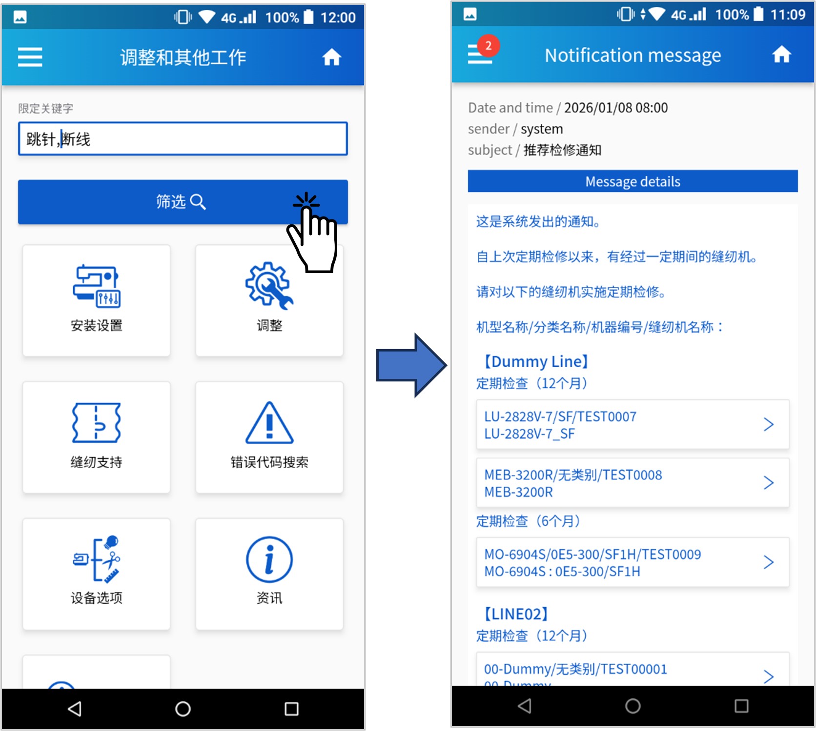 可以直接通過手機應用程序的通知消息,對指定的縫紉機進行檢修或零部件更換作業(yè)。