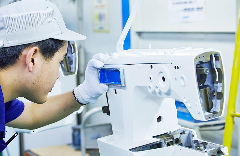 在自動化業(yè)務(wù)不斷進展的現(xiàn)在,涂裝部門對于“JUKI標志”的印刷、滿懷真心地一臺一臺地進行手工作業(yè)。