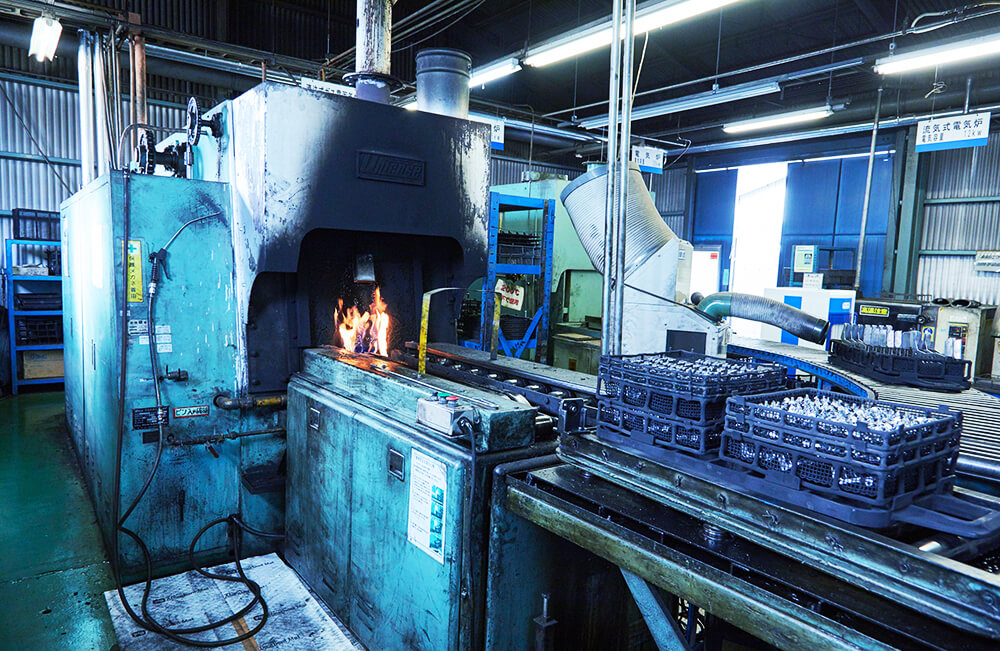 使低碳素鋼表面滲入碳素,提高碳素濃度后再進(jìn)行淬火的加工方法。表面硬、耐摩性出色,內(nèi)部柔軟、韌性出色??商幚頊囟葹?90℃~910℃。
