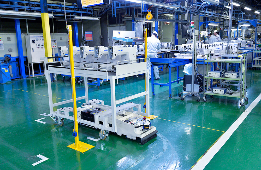 使用工廠內(nèi)搬運(yùn)作業(yè)自動(dòng)化的裝置自動(dòng)搬運(yùn)配件及半成品、成品等。以往活用的AGV的作為搬送車稼動(dòng),而新AGV將動(dòng)力裝置與平板推車完全分離,改善為動(dòng)力裝置稼動(dòng)牽引平板推車的方式。此項(xiàng)改善實(shí)現(xiàn)了投資金額的最小化。