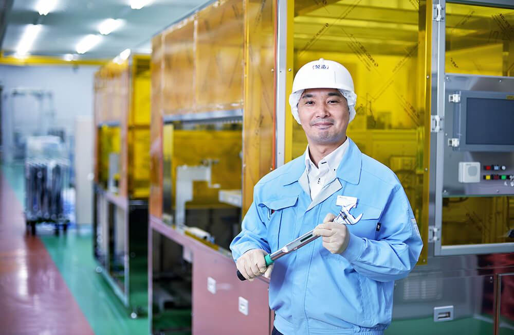 我們公司是開發(fā)、制造廣范活用于各種產(chǎn)品的“平板顯示器”等用制造裝置的制造廠。產(chǎn)品中既有重達(dá)60噸的巨大裝置,又有要求微米單位精度的精密機(jī)器。