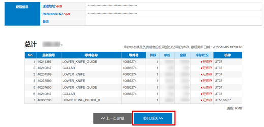 ④顯示確認(rèn)畫面,確認(rèn)輸入內(nèi)容?品號(hào)?數(shù)量等。如果內(nèi)容無(wú)誤,點(diǎn)擊「委托發(fā)送」按鈕。
