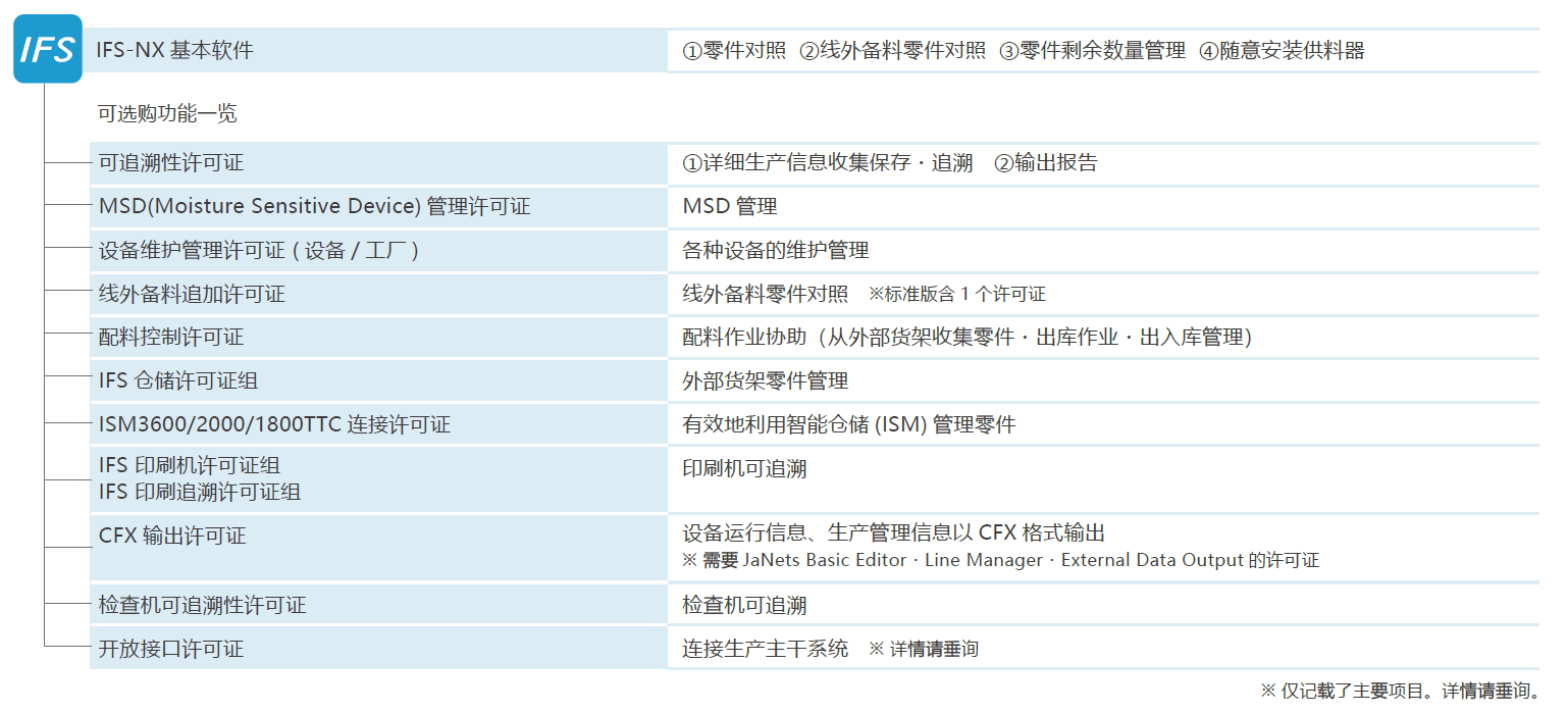 系統(tǒng)具備防止零件誤安裝、可追溯性等品質(zhì)管理功能,可提升效率的外部準(zhǔn)備功能、零件剩余數(shù)量管理功能?!砂葱柽x擇追加功能